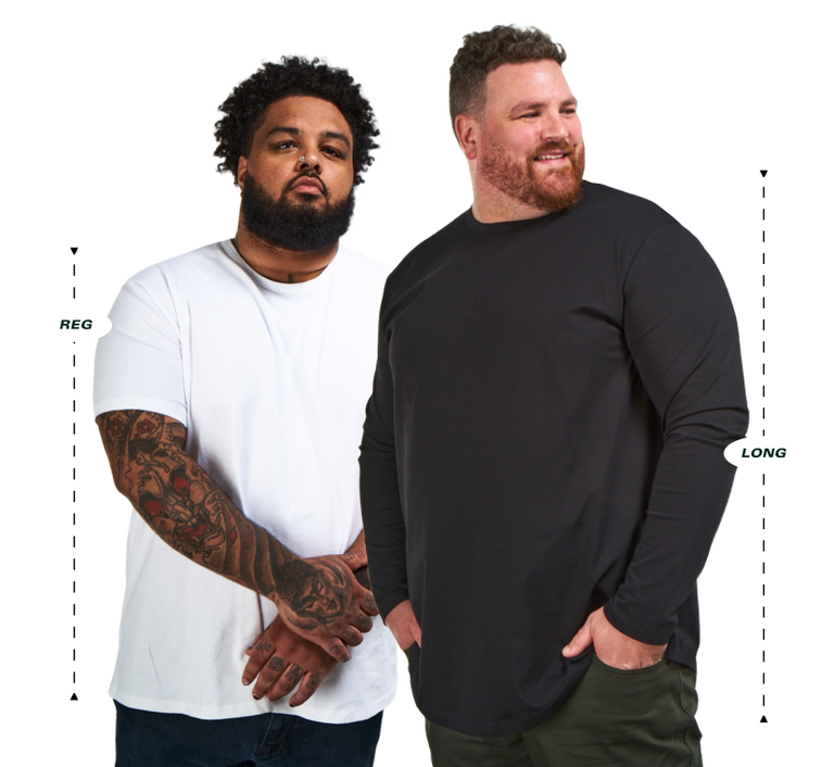Our Regular Length is often preferred by guys under 6’2”, and boasts a classic traditional cut. If you don’t like your tees too long and are used to buying XL (big) sizes, we recommend this length.