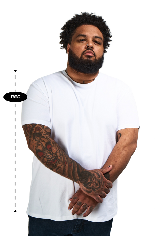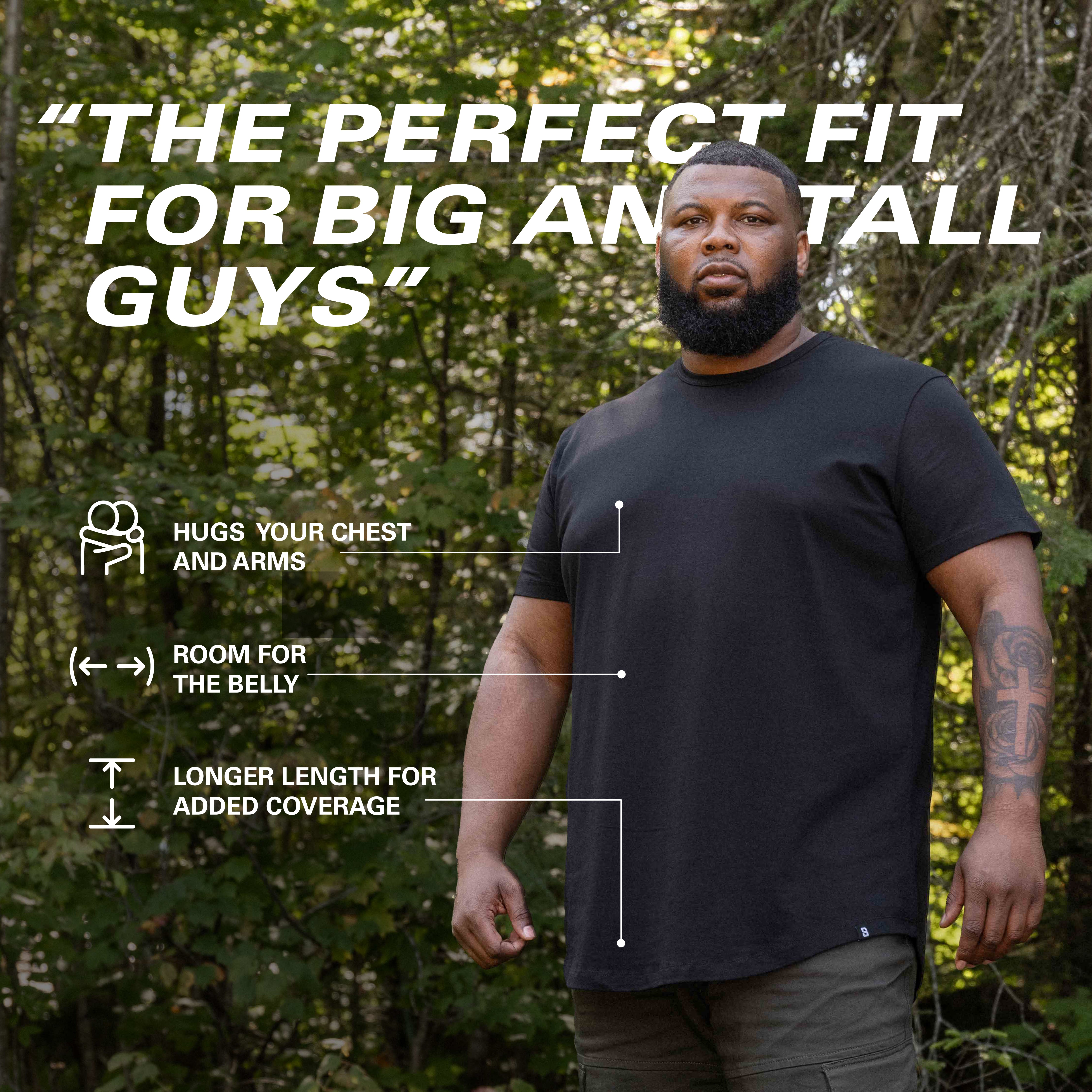 Our most loved tee, now offered in a standard length. Still breathable, stretchy, and built for bigger frames—just with a more traditional cut.