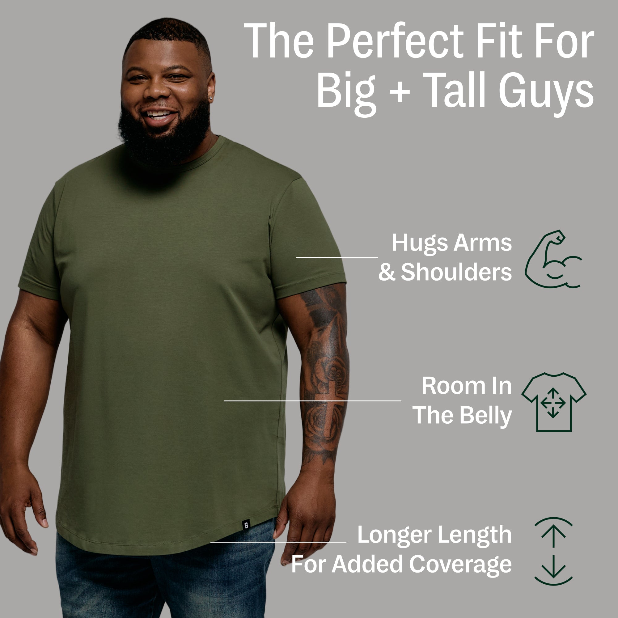 The t-shirt that started it all—tailored up top, roomy where it counts, and built with breathable, midweight stretch fabric that moves with you, holds its shape, and delivers extra coverage with a longer length.