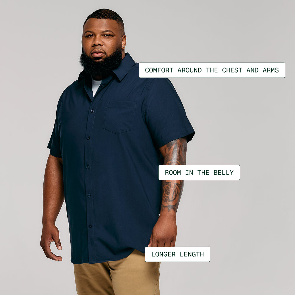 A breathable, wrinkle-resistant button-up built for bigger bodies—soft, stretchy, and sharp all day.